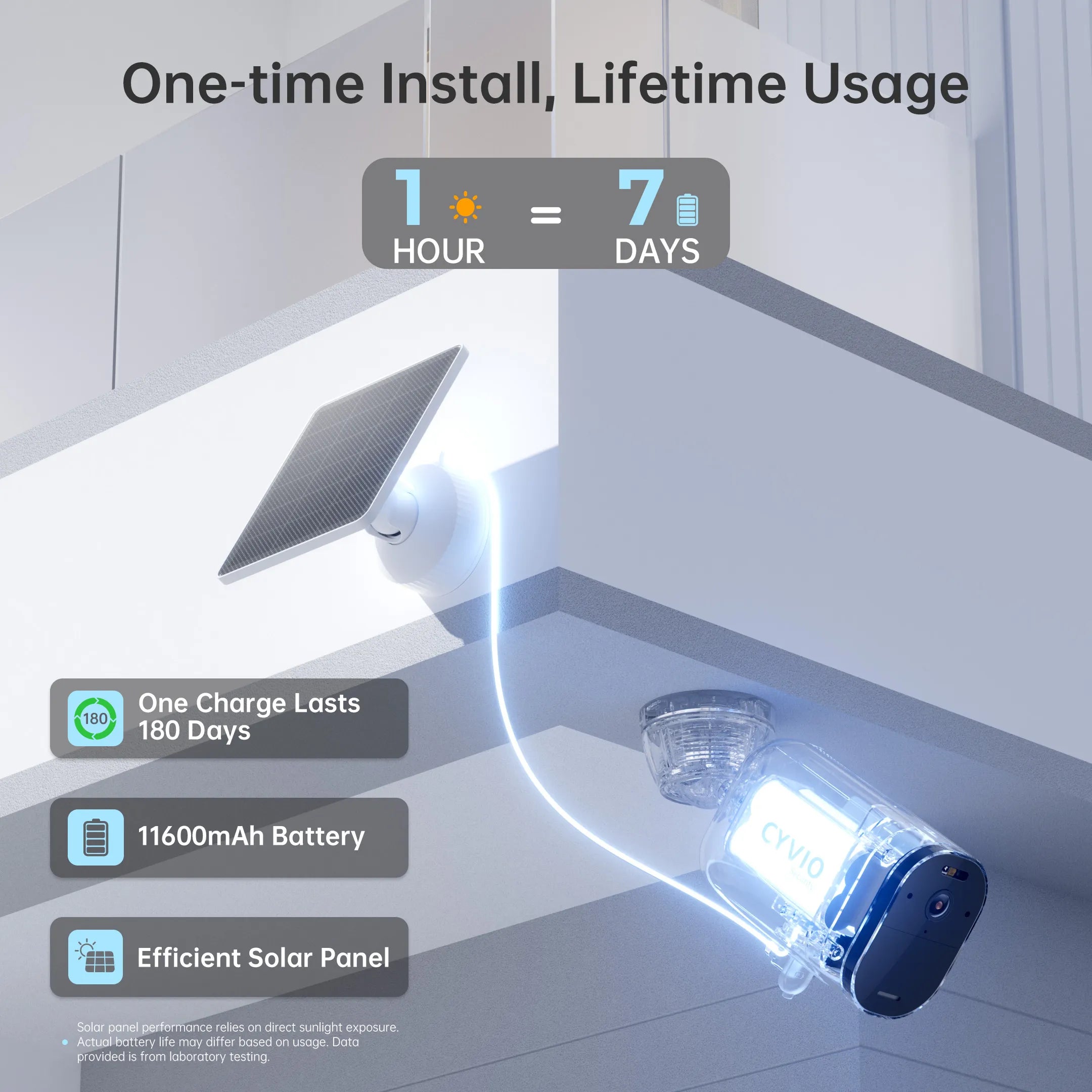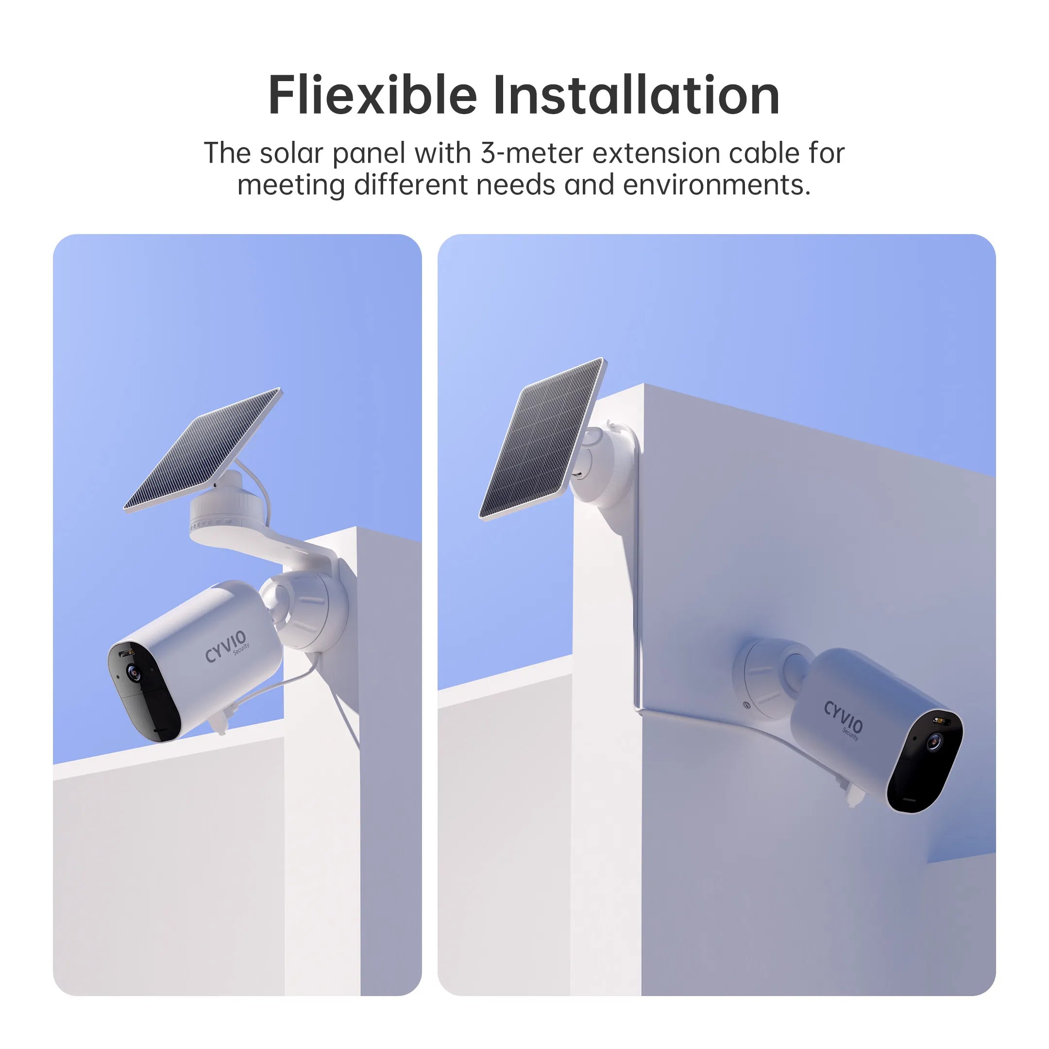 Install the battery camera and solar panel separately when needed. Comes with extension cables for flexible placement.