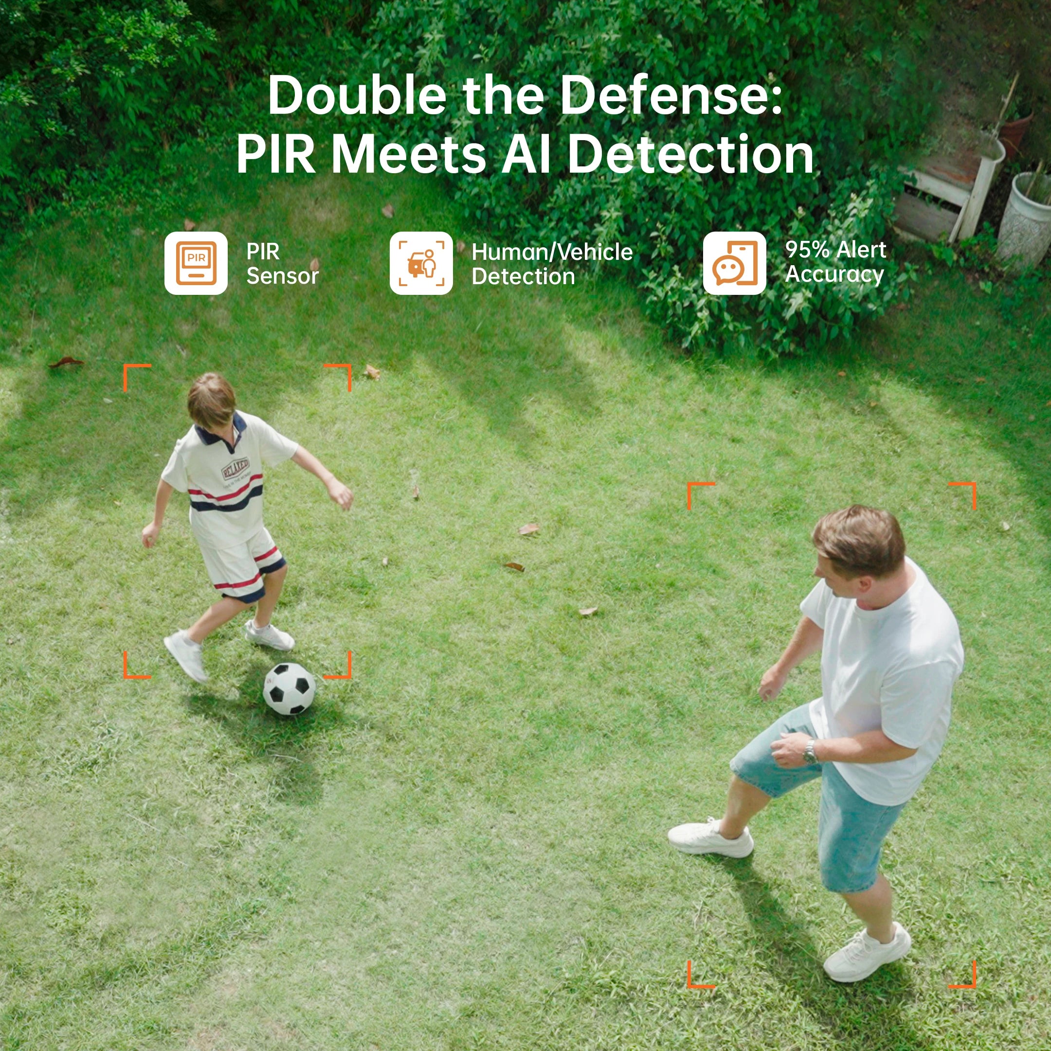 The PIR motion sensor and AI detection specifically identify humans and vehicles, minimizing false alarms for precise notifications.